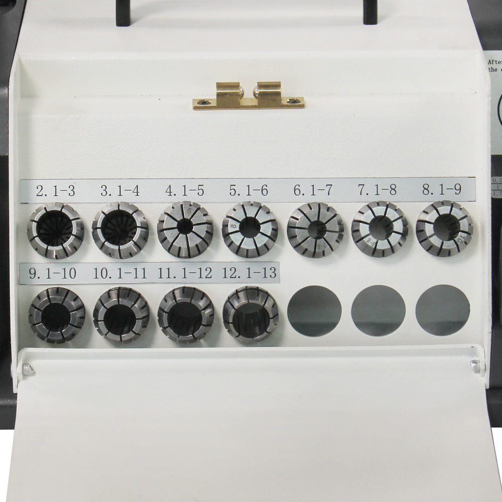 11 collets: 3 mm, 4 mm, 5 mm, 6 mm, 7 mm, 8 mm, 9 mm, 10 mm, 11 mm, 12 mm, 13 mm
