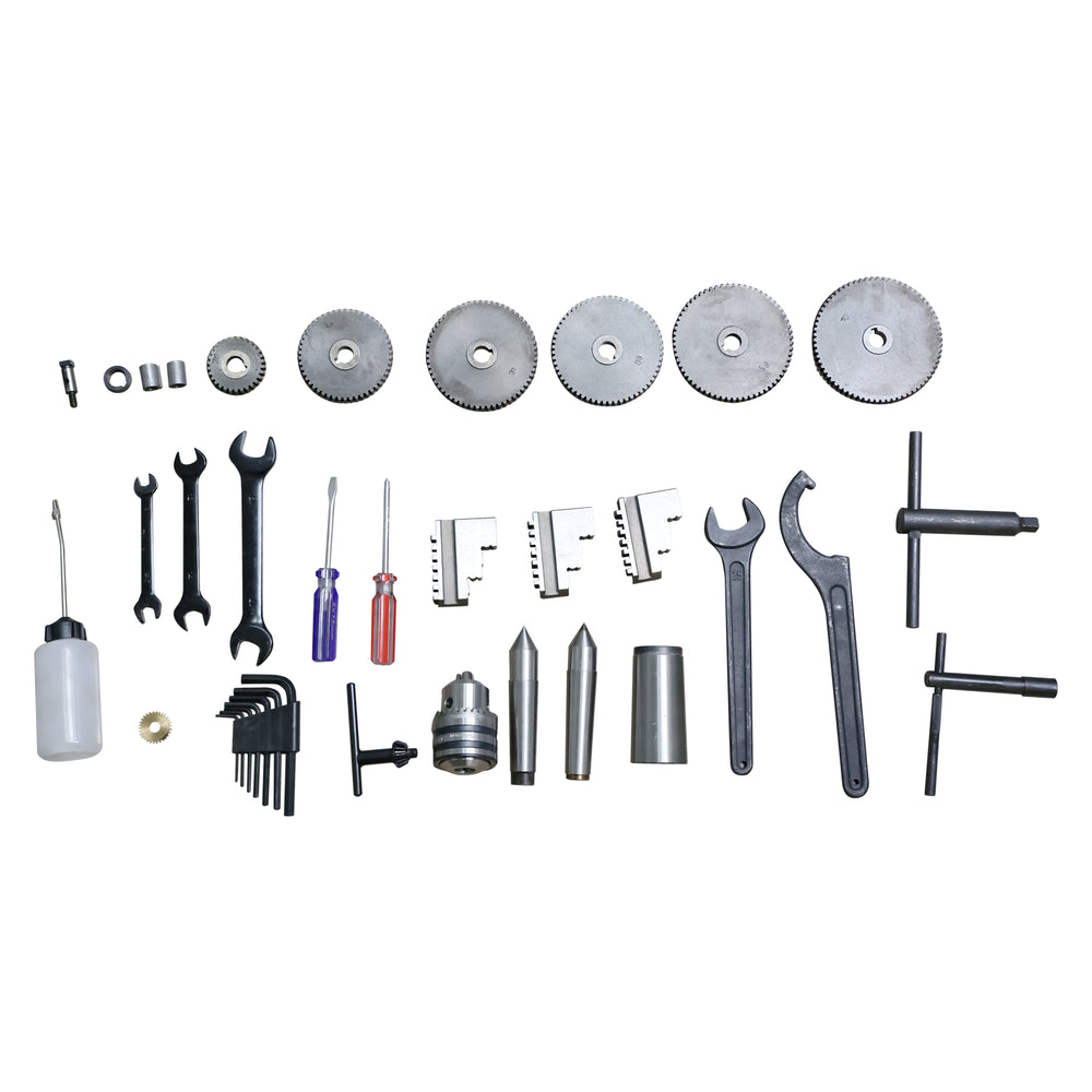 3-Jaw Chuck, 4 Jaw Chuck, Face Plate, Steady Rest, Follow Rest, Chuck Cover, Leadscrew Cover, Centers, Chip Tray, Stand, Coolant System, Working Light,